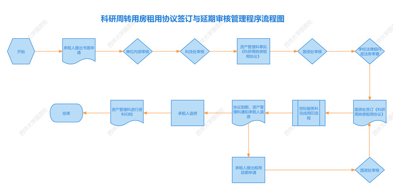 科研周转用房租用协议签订与延期审核管理程序流程图